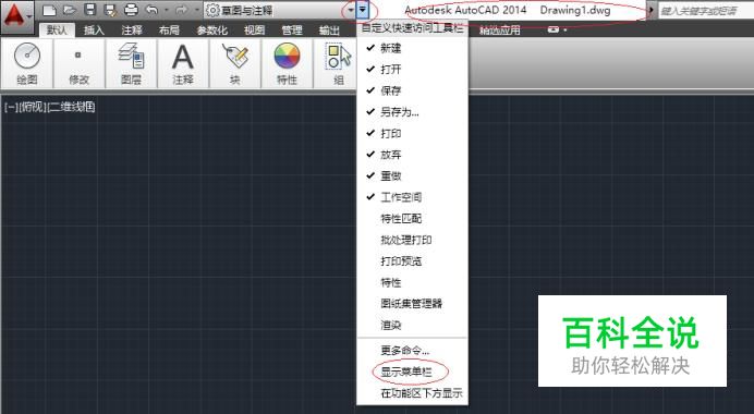 启动AutoCAD 2014辅助设计软件,如图所示。点击自定义快速访问工具栏向下箭头,弹出下拉列表选择"显示菜单栏"项。