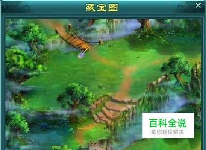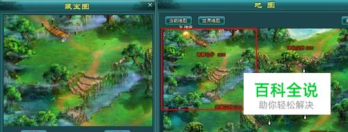 2、寻找藏宝图上的标志性参考物,对比野外地图,锁定目标。 有两座桥,有峡谷,有河流,有树,很容易就可以确定这个是蛮荒丛林地图的左上部分。