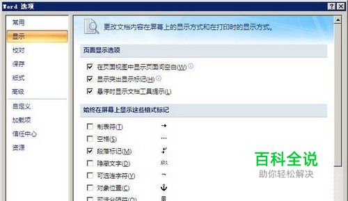 第2步,在打开的“Word选项”对话框中切换到“显示”选项卡,在“始终在屏幕上显示这些格式标记”区域选中“显示所有格式标记”复选框,并单击“确定”按钮,如图2012040202所示。 图2012040202 选中“显示所有格式标记”复选框