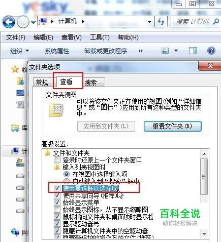 在“文件夹选项”设置面板中选择“查看”选项卡, 勾选“使用复选框以选择项”,按下“确定”按钮。