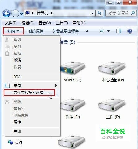 按快捷键“Win+E”或者直接鼠标双击“计算机”图标,在Win7资源管理器界面中点击“组织—文件夹和搜索选项”。