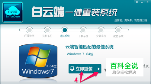 打开下载好的“白云端一键重装大师”,软件初始化后会出现一个“开始重装系统”,点击进入下一步