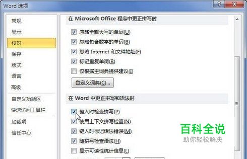 第2步,打开“Word选项”对话框,切换到“校对”选项卡。在“在Word中更正拼写和语法时”区域选中“键入时检查拼写”复选框,并单击“确定”按钮,如图2012030904所示。 图2012030904选中“键入时检查拼写”复选框