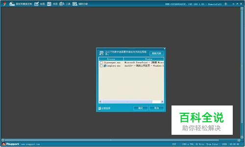 远程连接成功后,在受控端计算机上将显示如下图所示Viewer中间的小窗口,可以看见此小窗口中显示当前受控端计算机正在运行两个程序,这里选择左下角的“全选”将整个桌面共享给远程计算机(若这里只选择窗口列出的两项,那么控制端只能看见和远程操作此两项)。 被控端选择“全选”共享整个桌面