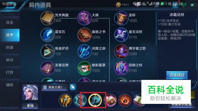 出装二:冰霜法杖。作用:唯一被动结霜,技能命中敌人时,会降低它20%的移动速度。