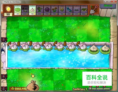 攻略:找不到稳定方法,只好用了小猫(没钱?先去打别的挣钱再来买吧),开始迅速收集阳光攒猫,然后出蒜,随时注意补蒜,超简单完成。
