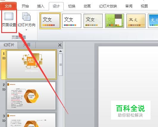 在“设计”选项线面的工具栏中找到“页面设置”,点击并进入,如图所示。