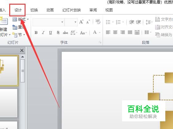 在PPT的菜单栏中点击“设计”选项,如图所示。