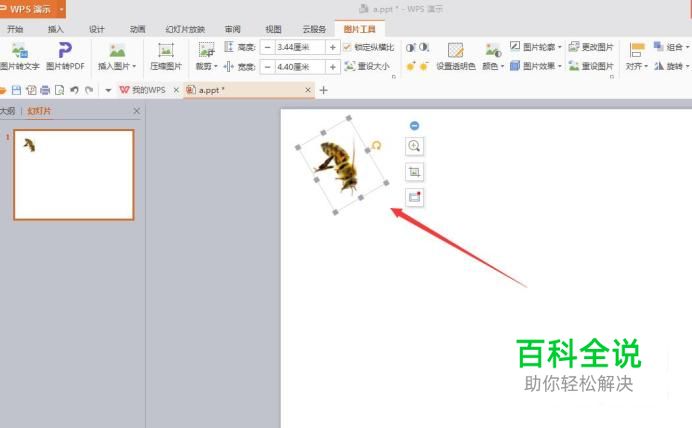 蜜蜂图片 然后在PPT空白页面的地方插入一张【蜜蜂图片】,并且更改图片的大小与方向,结果如下图所示: