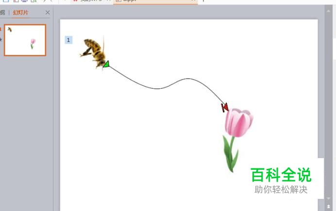 自定义动画 然后切换到【动画】选项卡,点击【自定义动画】,然后选择【曲线】,画出蜜蜂到花朵的曲线,预览一下,看起来就像蜜蜂飞向花朵去采蜜一样,如下图所示: