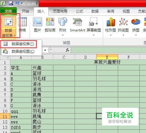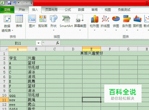 如图片中的例子,如果要统计某班学生的每项兴趣爱好的人数。我们首先在excel的工具栏里面点击到"插入"选项