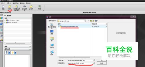 点击【打开】。找到保存的cad文件,【文件类型】选择『*.dwg』。如图所示,点击【ok】