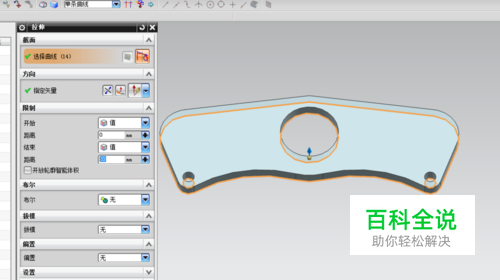 弹出【拉伸】对话框。选择曲线(全选),距离自定义,其他设置默认。