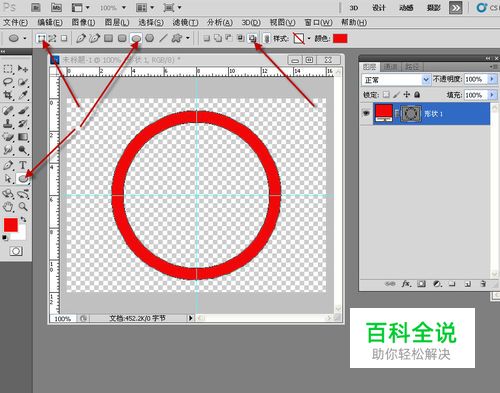 建立新画布,建立十字参考线,用椭圆形工具,设置形状图层重叠区域形状除外,就是减加第5个工具按钮. 在中心拉出一个大圆和一小园,相减出一个园.