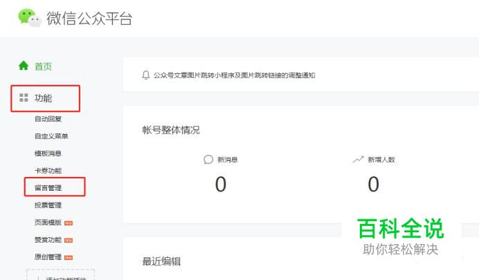 输入账号密码后进入公众号首页,在“功能”里找到“留言管理”选项。如图所示: