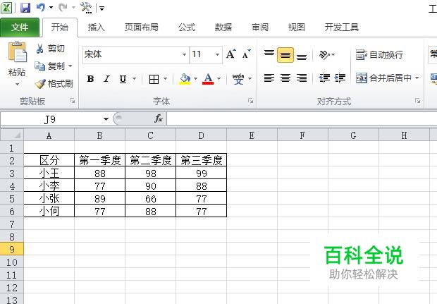首先,我们打开一个有内容的excel文档,如图所示,是销售人员的三个季度的销售额;