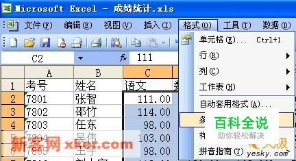 使用鼠标拖选中某一科或几科成绩所在的单元格(不要使用选中一整行或一整列的方法,不然没有数据的空单元格也会参加运算。)单击菜单栏“格式”→条件格式(如图1),打开“条件格式”对话框,单击“介于”后面的下拉按钮,选择“小于”,在其后的框内填入该科成绩的及格分数72,意思是小于72分为不及格。(如图2)