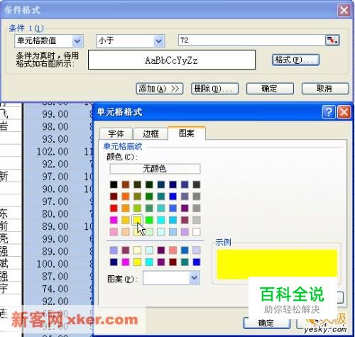单击“格式”按钮,在打开的“单元格格式”对话框中,选择“图案”选项卡(如图3), 在“颜色”项中选择“黄色”,最后依次点“确定”退出。这样不及格的分数就变成“黄底黑字”了。(如图4)