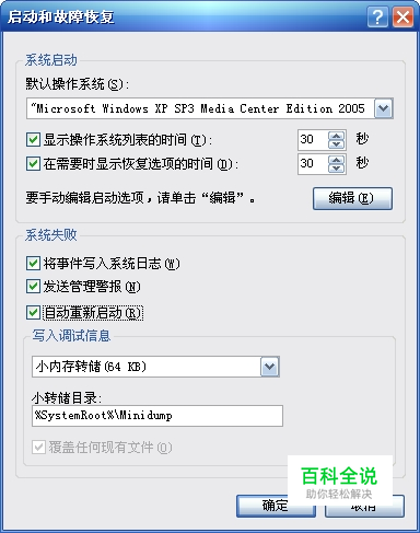在默认的系统设置中,Windows 2000遇到“蓝屏”故障后“蓝屏”错误信息将长时间停留在显示屏,直到您关闭或重新启动计算机;Windows XP及后续版本的Windows遇到“蓝屏”故障后“蓝屏”错误信息将在短时间显示之后自动重新启动计算机。