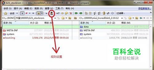 分别把以上两个rom包解压到同一个文件夹里面,然后打开BCompare对比软件,把解压后得到的miui_IncredibleS_2.10.12和G21_stockrom文件夹拉到BCompare进行比对,请把G21_stockrom放到左侧,把miui_IncredibleS_2.10.12放到右侧