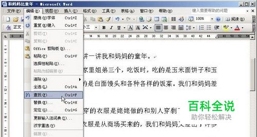 第1步,打开Word2003文档窗口,依次单击“编辑”→“查找”菜单命令,如图2011061603所示。 图2011061603 选择“查找”菜单命令