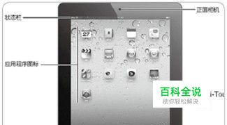 下图是一张iPad的正面图片。我们可以看到iPad的整个外观非常简洁,在正面可以看到的按钮实际上只有一个“主屏幕按钮”,除此以外就是摄像头和一块大大的屏幕。开机之后首先展示的是iPad主界面,这里放置的就是iPad自带各项功能的按钮图标。