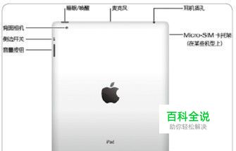 翻到背面,我们可以看到iPad的更多操控按钮和接口。这里包括了睡眠按钮、音量按钮、后罝摄像头、侧边开关、麦克风、耳机插孔等,如图。