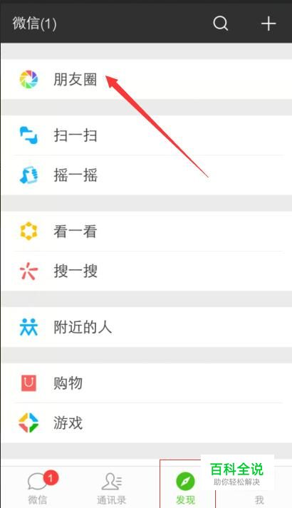 进入到个人微信界面,然后点击发现找到朋友圈,如下图;