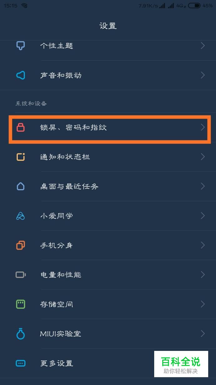 首先打开手机的"设置",然后在"系统与设备"里面找到"锁屏、密码与指纹"。
