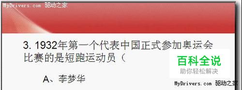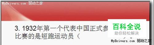 新建演示文稿,模板选用教程模板,板式为空白。依次单击“插入”-“文本框”-“横向”命令,此时鼠标变成十字型,左键单击按住拖出一个文本框,输入文字“3.1932年第一个代表中国正式参加奥运会比赛的是短跑运动员()。”,设置字体为宋体,32号字,通过拖动调整文字位置。