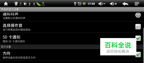 桌面状态下按“菜单键”,点击“设置”,然后再点“声音和显示”。