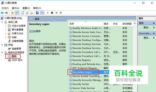 然后在找到“服务”,进入服务管理页面,找到“secondary logon”服务,启动服务即可,类似于第一个方法。