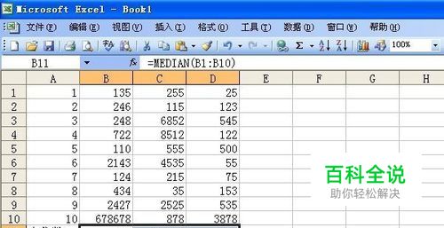 下面我们来验证所求中位数是否正确。 如,我们在E1栏输入1、2、3、4、5、6、7、8、9、10。
