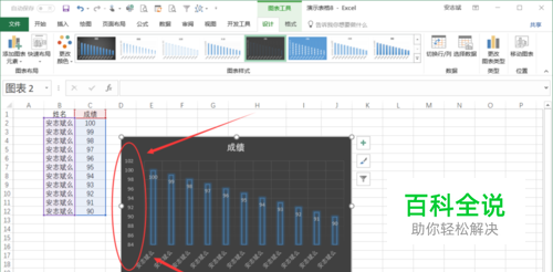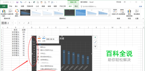 在表格右侧弹出的【设置坐标轴格式】菜单中,可以看到【边界】后面的数值就是可以调整的Y轴数据; 。 为了更加明显的看出数据的浮动,我们可以把数据区间调整90到100浮动; 。 最大值和最小值输入后都是【Enter 回车键】结束;可以看到后边显示(重置) 如图所示: