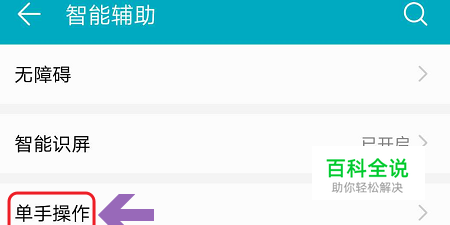 然后在设置界面中选择“智能辅助”选项,点击此项即可看到“单手操作”模式了,见图二...