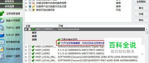 虽然不能通过大师进行删除,但是可以进行注册表位置定位,点击搜索出来的注册信息最前方的那个加号,可以看到“打开注册表编辑器,并定位到该注册表位置”字样,点击该行文字,自动定位到注册表,再进行该键值删除。该方式主要是用来判断7D2F键值是否全部删除完了。(注意:如果安装有多个CAD,删除键值时要注意看右边的信息,不要删除到其他CAD的键值,也就是说安装有多个CAD时,该方式也无法判断是否全部删除)