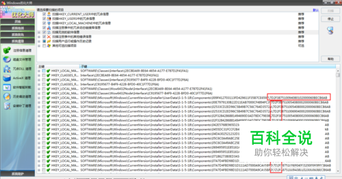 先说说找不到或者不知道有没有找全这种情况。这里我利用的是优化大师的注册信息清理里面的查找目标这个功能,其实也可以直接用注册表自带的搜索功能,但是它只能找完一个再进行下一个搜索。这里我们在目标字符串框填“7D2F”,把下面 大小写匹配等三个框框都勾选,然后点击确定进行搜索。