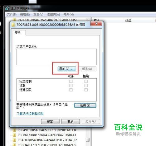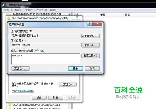 点击“添加”,在最下面那个输入对象名称的文字框里输入“everyone”,点击确定。