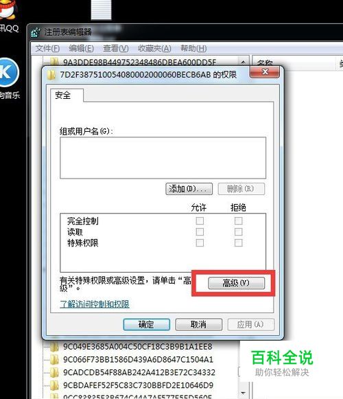接着,我们可以看到里面的“组和用户名”是空白的,点击“高级”,系统继续跳出“您没有权限查看XXX的目前权限设置,但是您可以更改权限”这句提示,继续确定。
