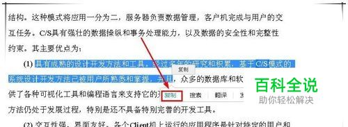 直接复制?不要以为自己看错了,的确是直接复制,不过!不过每次只能复制很小一段文字,而且必须用百度文库自带的功能,CTRL+C之类快捷键都不能用。 方法: 拖动选择要复制的一小段文本(最多二行半左右),停止拖动后,在下方出现的工具框中选择“复制”,即会提示复制成功。
