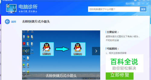 如何利用腾讯电脑管家去除桌面快捷方式小箭头? 2025-05-14 15:01:26 废话不多说,看! 操作方法 01 打开 腾讯电脑管家 ,点击 工具箱。 02 点击 电脑诊所。 03 点击 桌面图标。 04 点击 如图图片 05 点击 立即修复 赞 (0) 相关推荐 怎么用电脑管家去除桌面快捷方式小箭头 电脑管家是一款功能强大的电脑管理软件,有些用户想知道怎么用该软件去除桌面快捷方式小箭头,接下来小编就给大家介绍一下具体的操作步骤.具体如下:1. 首先第一步解锁电脑进入桌面,根据下图箭头所指,发现图标 ... 利用代码去除桌面快捷方式小箭头 快速去除桌面快捷方式小箭头 操作方法 01 桌面新建一个文本,然后输入代码:reg add "HKEY_LOCAL_MACHINE\SOFTWARE\Microsoft\Windows\Cu ... 去除桌面快捷方式小箭头 效果图如上 步骤/方法 01 点击电脑开始按钮 选择运行 02 输入 cmd /k reg delete "HKEY_CLASSES_ROOT\lnkfile" /v IsShor ... win10去掉桌面快捷方式小箭头 通过删除注册表键值的方法来去除桌面快捷方式小箭头 操作方法 01 在Cortana搜索框处输入regedit打开注册表编辑器 02 按照图示路径找到位于lnkfile文件夹下的注册表键值 03 删除键 ... win10系统怎么去除桌面图标小箭头 现在大部分电脑都是win10系统,有些新用户不知道怎么去除桌面图标小箭头,接下来小编就给大家介绍一下具体的操作步骤.具体如下:1. 首先第一步进入电脑桌面,根据下图箭头所指,发现图标左下角显示小箭头. ... WIN7如何去除桌面图标小箭头 WIN7如何去除桌面图标小箭头 方法一:使用注册列表删除 01 在开始里输入"regedit",选择出现的"regedit" 02 进入注册列表,找到HKEY_ ... win10如何去除桌面图标小箭头 微软的Windows就通过在桌面图标上增加"小箭头",来区分它是属于正经的应用程序.文件还是快捷方式.坏处就是对有强迫症.要求统一的用户来说,这个小箭头实在是太碍眼了! 如果你属于 ... 去除桌面图标小箭头的方法 今天小编要和大家分享的是去除桌面图标小箭头的方法,希望能够帮助到大家. 操作方法 01 首先在开始菜单中输入"regedit",如下图所示. 02 然后点击程序"rege ... 怎样消除桌面快捷方式小箭头 怎样消除桌面快捷方式小箭头? 怎么去掉桌面快捷方式小箭头? win7系统桌面快捷方式的小箭头怎么去掉啊? w7系统桌面快捷方式小箭头怎么去掉? 去掉桌面图标快捷方式上的小箭头如何修改?? 桌面 ...