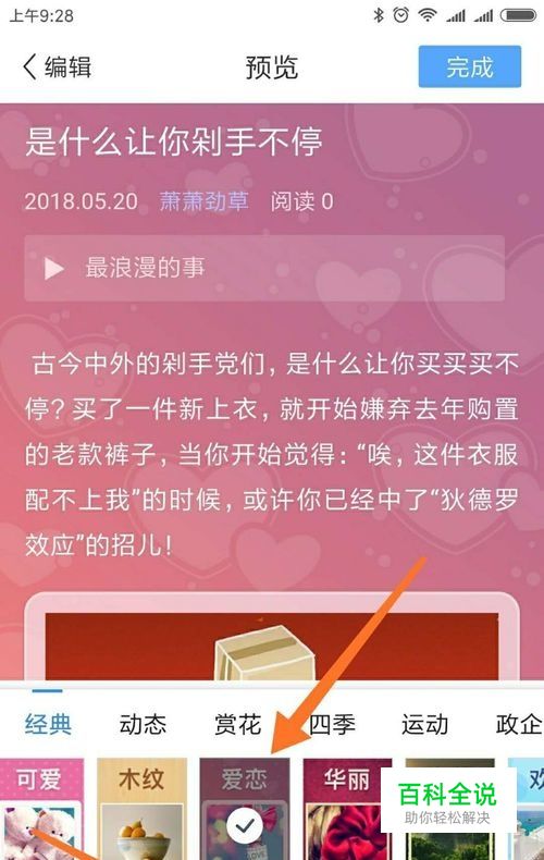 现在让我们为它配上适当美妙的音乐吧,点击下面箭头所指的背景音乐选项,然后再选择点击自己喜欢的音乐,选完后点击右上角的完成。