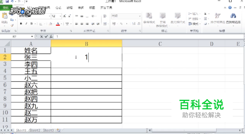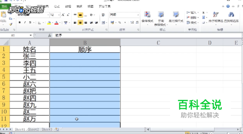 按下鼠标左键的同时按下ctrl键,鼠标往下拉到最后一个单元格,即“赵万”后面的单元格,这样顺序这一列就自动填充为1-10了。