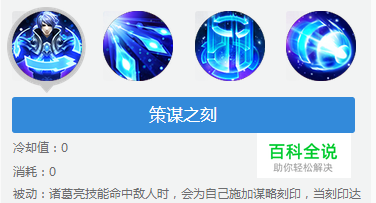 首先是诸葛亮的被动技能(详见下方图片内)为诸葛亮技能命中敌人时,会为自己施加谋略刻印,当刻印达到5层时,会召唤5颗法球围绕自身,短暂时间后依次飞出攻击附近的敌人(优先英雄)造成270(+52%法术加成)点法术伤害。法球在1秒内连续命中同一目标时,伤害会衰减到20%。(法球不会攻击非战斗状态的野怪)