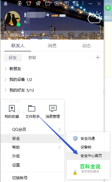 弹出上拉菜单,选择其中的安全>>>安全中心首页,如下图所示。