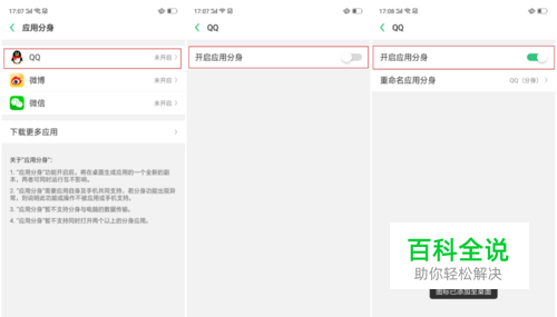 2、进入相应界面--可以开启可分身程序的开关,还可以下载更多支持分身的应用、重命名分身的应用。 这里以【qq】为例。