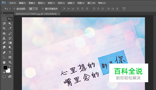 打开PS,选择一张带有图片的文字进行接下来的操作示范。如图,图片已经呈现在画布中了。