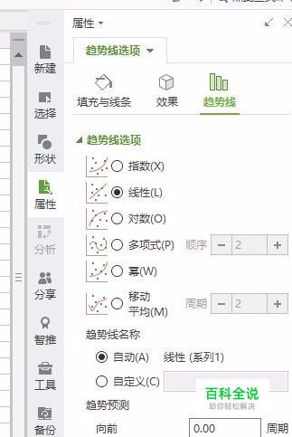 同时,右侧的属性栏也出现了有关趋势线的设置。在这里你可以选择趋势线的各种选项,有线性,指数等。