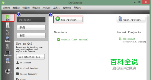 启动QtCreator,确保处在欢迎界面,然后点击“New Project”(新工程)按钮。