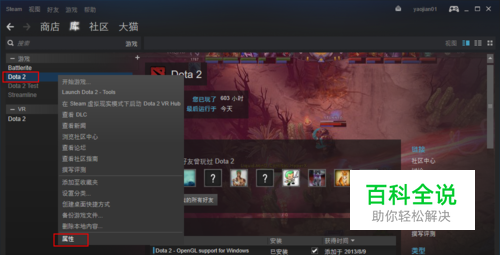 打开Steam,选择出问题的游戏(例如“DOTA2”)右键-“属性”。
